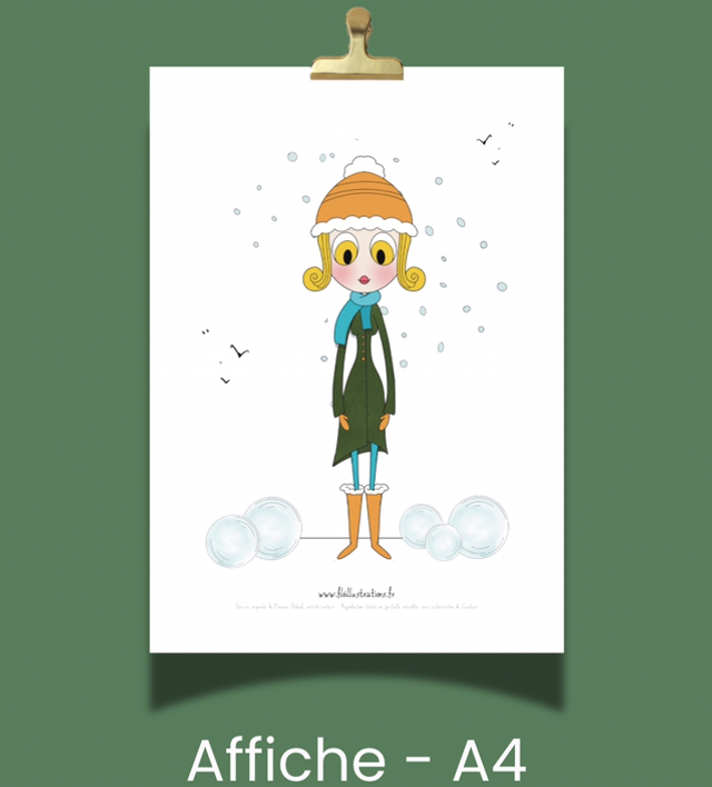 Cette illustration dessinée à la main, sans IA, capture la douceur d'un moment de jeux, sous la neige, au coeur de l'hiver.